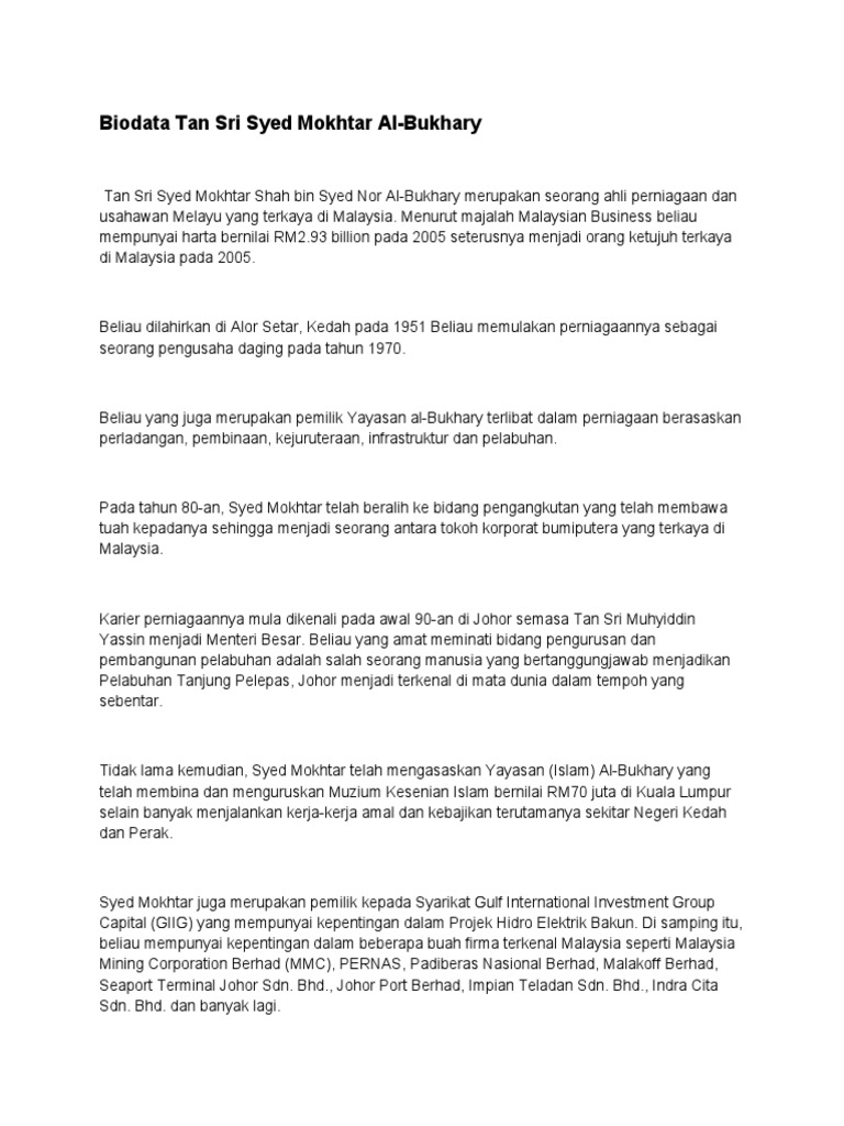 His father was a trader who had travelled to central asia and thailand in his youth before settling down in kedah during the 1940s. Tan sri syed mokhtar juga telah mengasaskan yayasan albukhary. Before this, we just heard his name without knowing his background. He is also the richest malay in this country and. Tan sri syed mokhtar refused and handed the permit back to the mara.