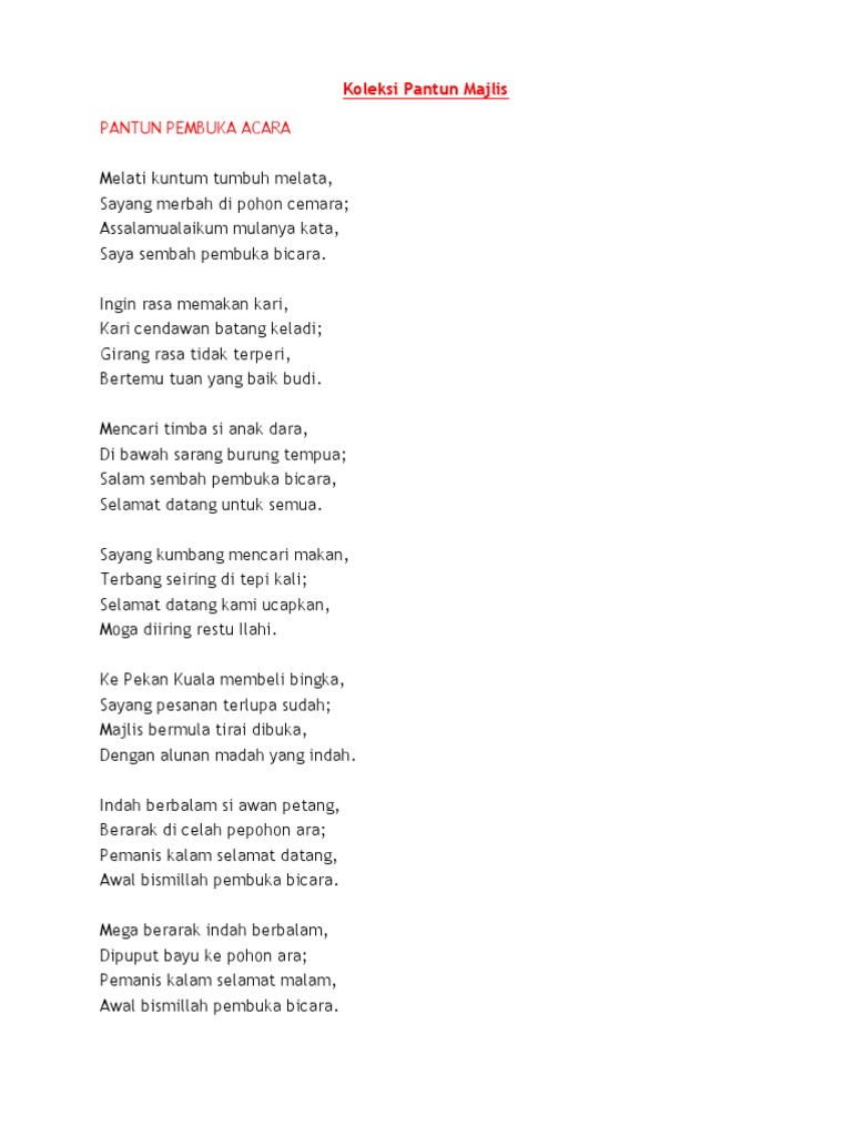 Koleksi pantun majlis by haliza hashim 90260 views. Selamat datang kami ucapkan, moga jutaan terima kasih kami ucapkan u capkan kain berlipat dalam istana pakaian puteri raja kayangan. Bukan karena minum jamu, tapi makan jambu klutuk. Di hari ini, sebagian besar instansi baik pendidikan maupun perusahaan akan meliburkan semua elemen dan lapisan. Pantun pembuka salam untuk pidato.